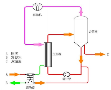 機械式蒸汽再壓縮MVR蒸發(fā)器利用蒸發(fā)器中產(chǎn)生的二次蒸汽,經(jīng)壓縮機壓縮,壓力、溫度升高,熱焓增加,然后送到蒸發(fā)器的加熱室當(dāng)作加熱蒸汽使用,使料液維持沸騰狀態(tài),而加熱蒸汽本身則冷凝成水。這樣,原來要廢棄的蒸汽就得到了充分的利用,回收了潛熱,又提高了熱效率,生蒸汽的經(jīng)濟性相當(dāng)于多效蒸發(fā)的30效,減少了對外部加熱及冷卻資源的需求,降低能耗,減少污染。